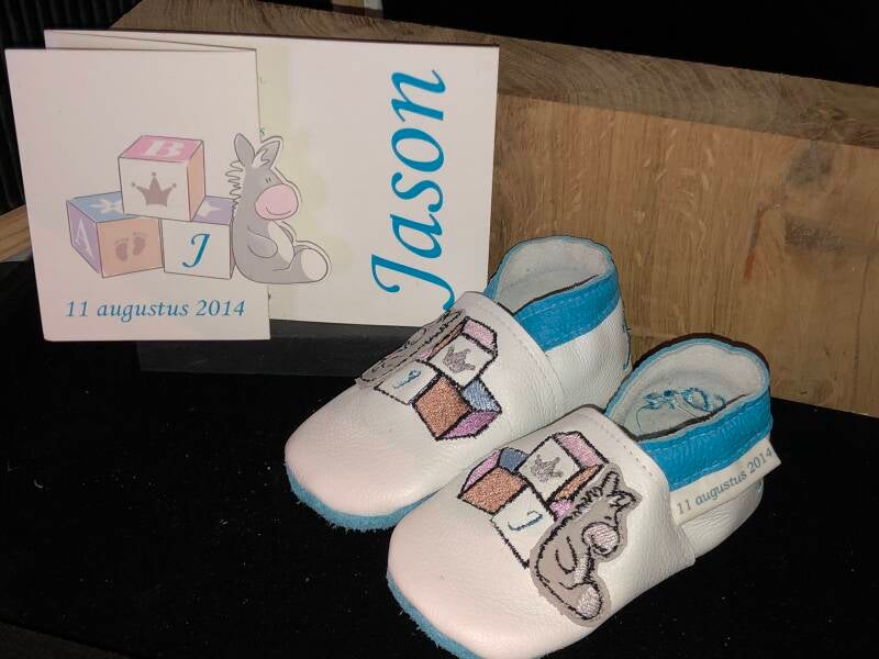 De naam van het kindje borduurt de borduurmachine op de slofjes. Soms plaats ik de naam op de wreef, dan weer op de hiel, maar net wat het mooiste uitkomt. Als je zelf een idee hebt over hoe de slofjes eruit moeten zien, dan hoor ik dit natuurlijk graag. Ik laat je dan weten wat er mogelijk is.