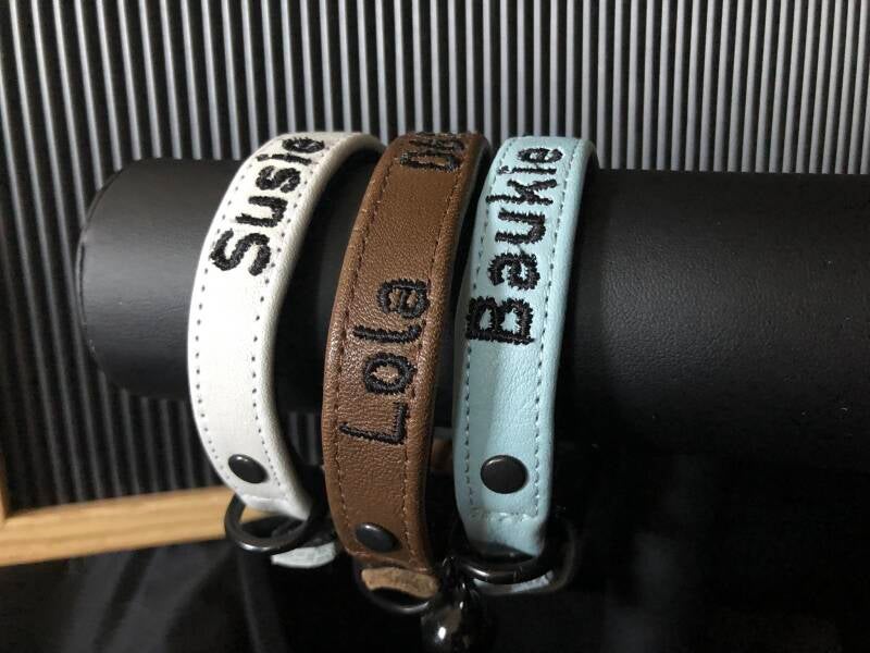 Er kan een tekst op het bandje geborduurd worden. Bijvoorbeeld de naam, of het adres, een postcode of een telefoonnummer. Teksten als "niet voeren" of "niet binnenlaten", het kan allemaal! De ruimte is wel beperkt, maar laat weten wat je wil en ik denk graag met je mee.