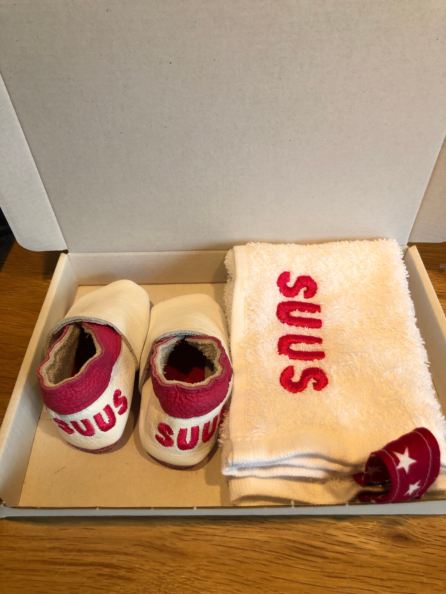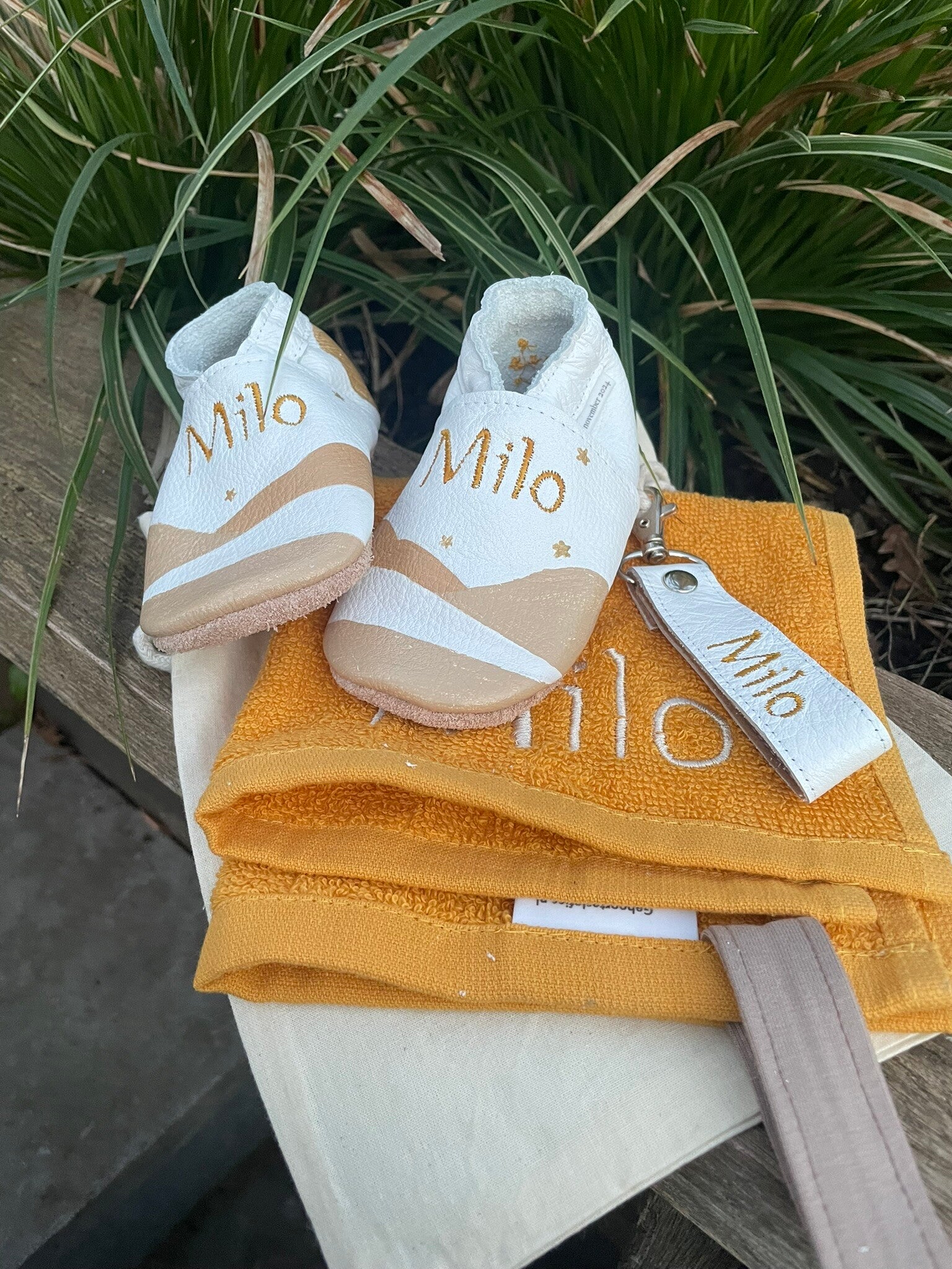 Standaard zitten er Slofjes met naam en een Speendoekje met naam in het pakket. Je kunt het pakket uitbreiden met extra opties hierboven. Je profiteert altijd van een korting van 10%.