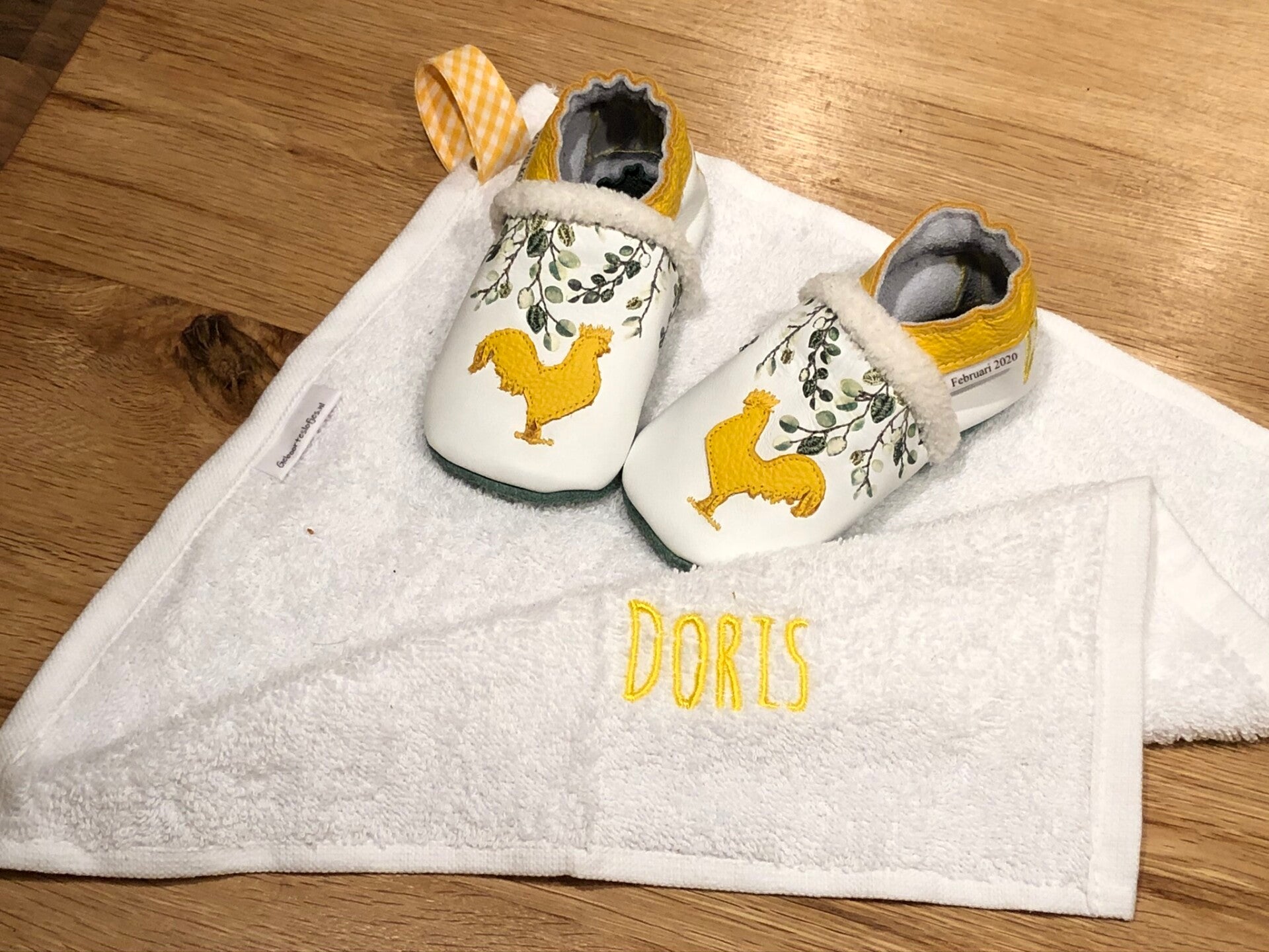De geboortedatum van het kindje, gedrukt op een stoffen label. Wordt aan de zijkant van het linkerslofje vastgenaaid.