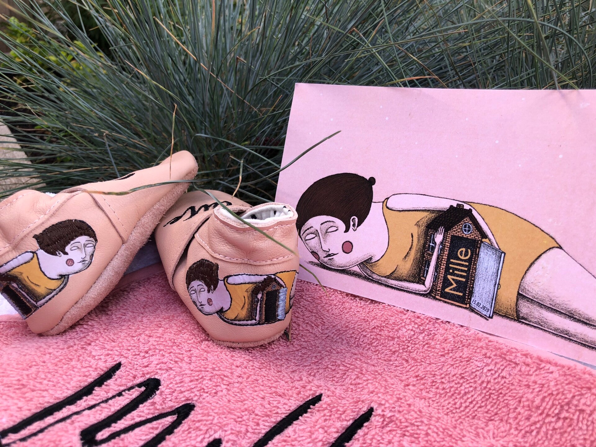 Uiteraard wordt alles op elkaar afgestemd qua kleur en stijl. En alle namen worden geborduurd in hetzelfde lettertype als het geboortekaartje.